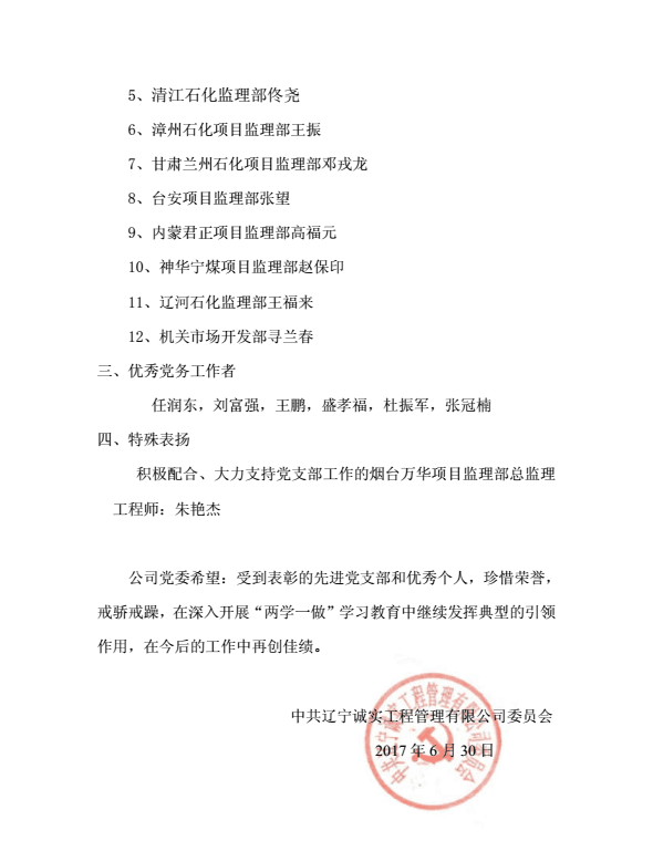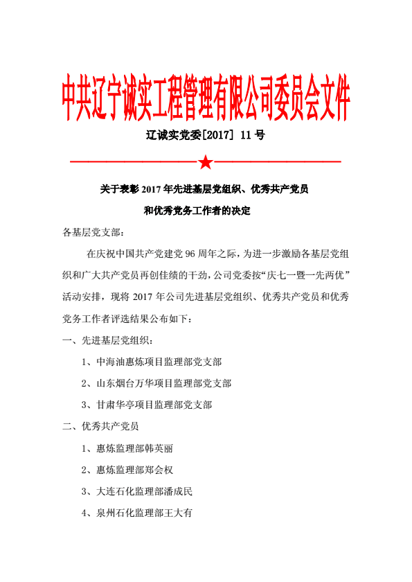 为庆祝中国共产党建党96周年,公司党委于20176月30下午在公司一楼会议室召开了庆祝建党96周年暨“一优两先”表彰视频大会公司机关、抚顺各项目监理部及在抚的党员同志在主会场参加了大会,中海油惠州项目监理部党支部、甘肃华亭项目监理部党支部、宁夏石化项目监理部党支部、中化泉州项目监理部党支部、广西石化项目监理部党支部、兰州石化项目监理部党支部、内蒙古君正项目监理部党支部、神华宁煤项目监理部党支部、烟台万华项目监理部党支部设立视频分会场。党委委员马骏主持了视频大会。首先,公司党委副书记冯玉琢同志宣读了“一优两先”表彰决定。接着,党委书记孙学良结合公司实际做了庆祝建党96周年的讲话。最后全体党员重温的入党誓词,进行入党宣誓。