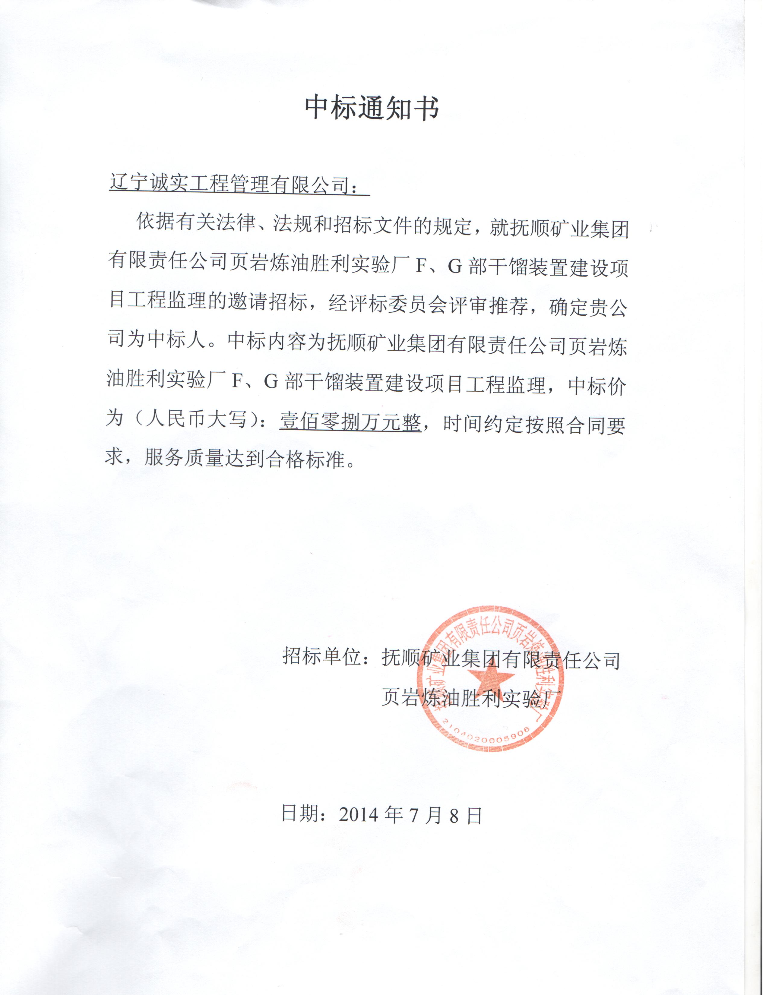 我公司成功中标抚顺矿业集团有限责任公司页岩炼油胜利实验厂F、G部干馏装置建设项目工程监理项目